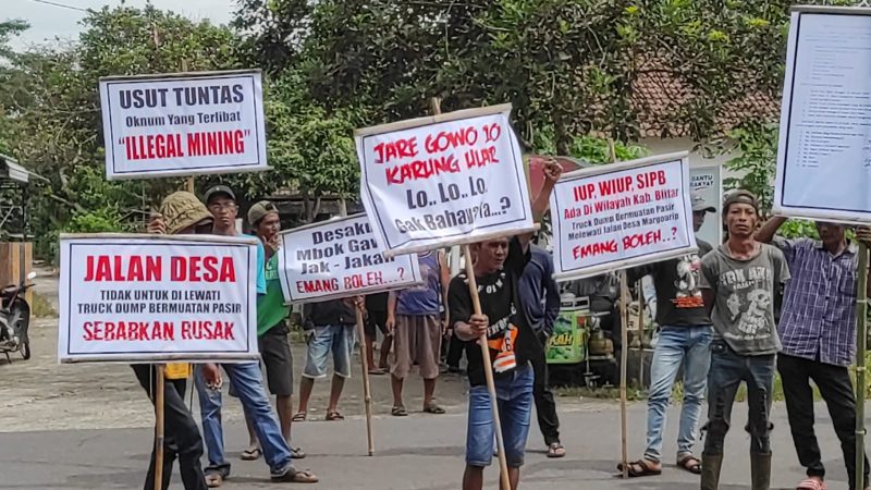 Ratusan warga yang berkumpul dan berunjuk rasa di depan Kantor Desa itu juga membawa berbagai papan bertuliskan, ” JARE GOWO 10 KARUNG ULAR, LO .. LO .. LO .., GAK BAHAYA TA … ? “, ” USUT TUNTAS Oknum Yang Terlibat  ILLEGAL MINING “, ” IUP, WIUP, SIPB Ada Di Wilayah Kab. Blitar, Truck Dump Bermuatan Pasir Melewati Jalan Desa Margourip, EMANG BOLEH ?”, ” JALAN DESA TIDAK UNTUK DILEWATI TRUCK DUMP BERMUATAN PASIR, SEBABKAN RUSAK “, dan ” Desaku Mbok Gawe Jak – Jakan, EMANG BOLEH … ?”.