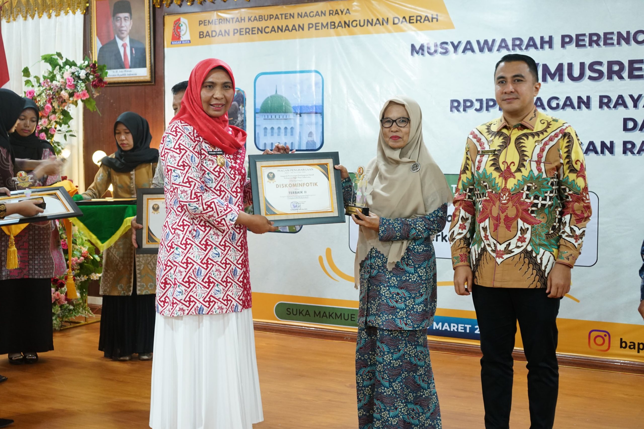 Piagam Penghargaan tersebut diserahkan langsung Penjabat (Pj) Bupati Nagan Raya Fitriany Farhas kepada Kepala Diskominfotik Nila Kasma, usai pembukaan Musyawarah Perencanaan Pembangunan (Musrenbang) RPJPK dan RKPK di Aula Badan Perencanaan Pembangunan Daerah (Bappeda) Kabupaten Nagan Raya, Kamis (28/3/2024).