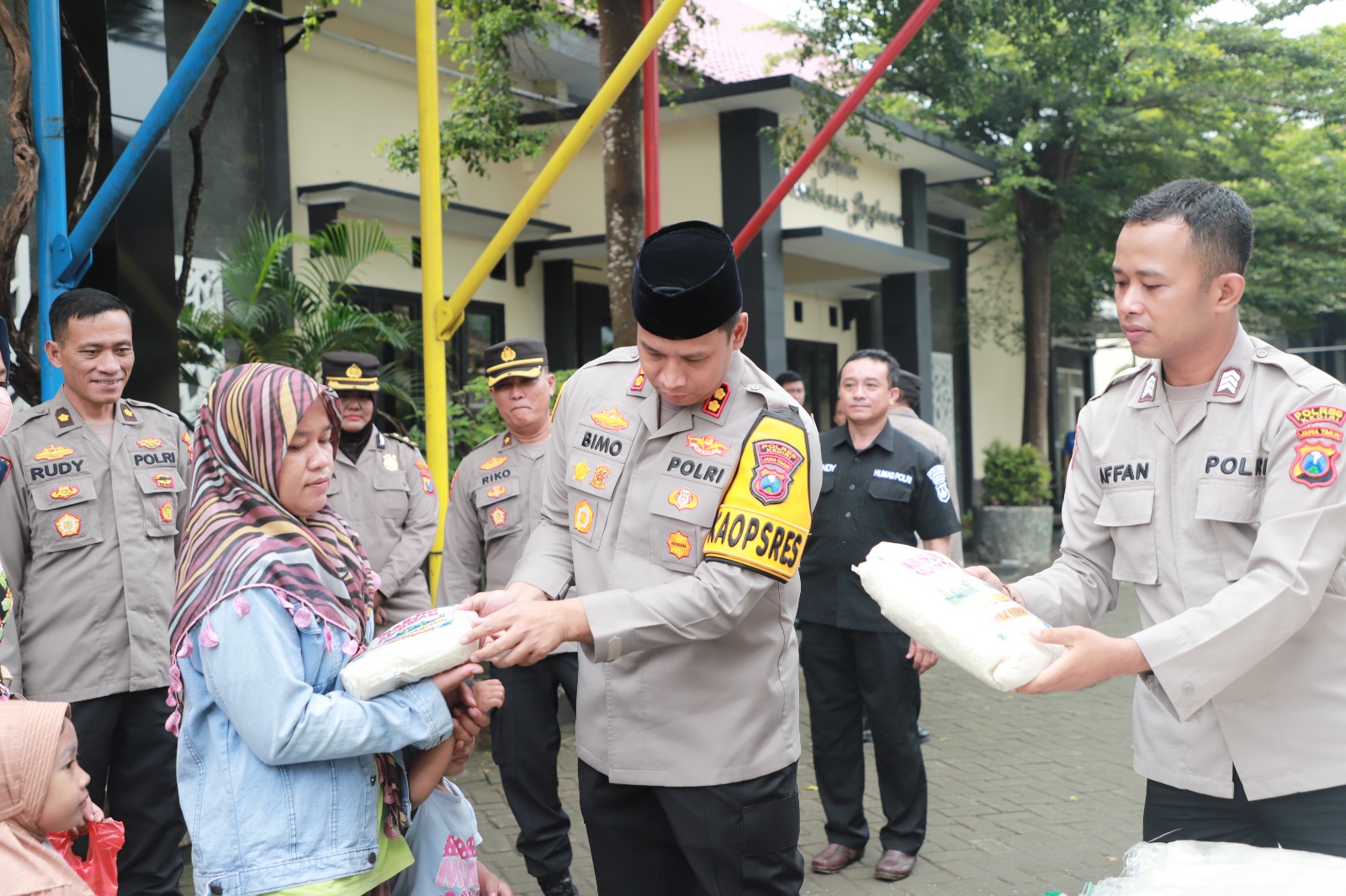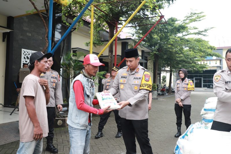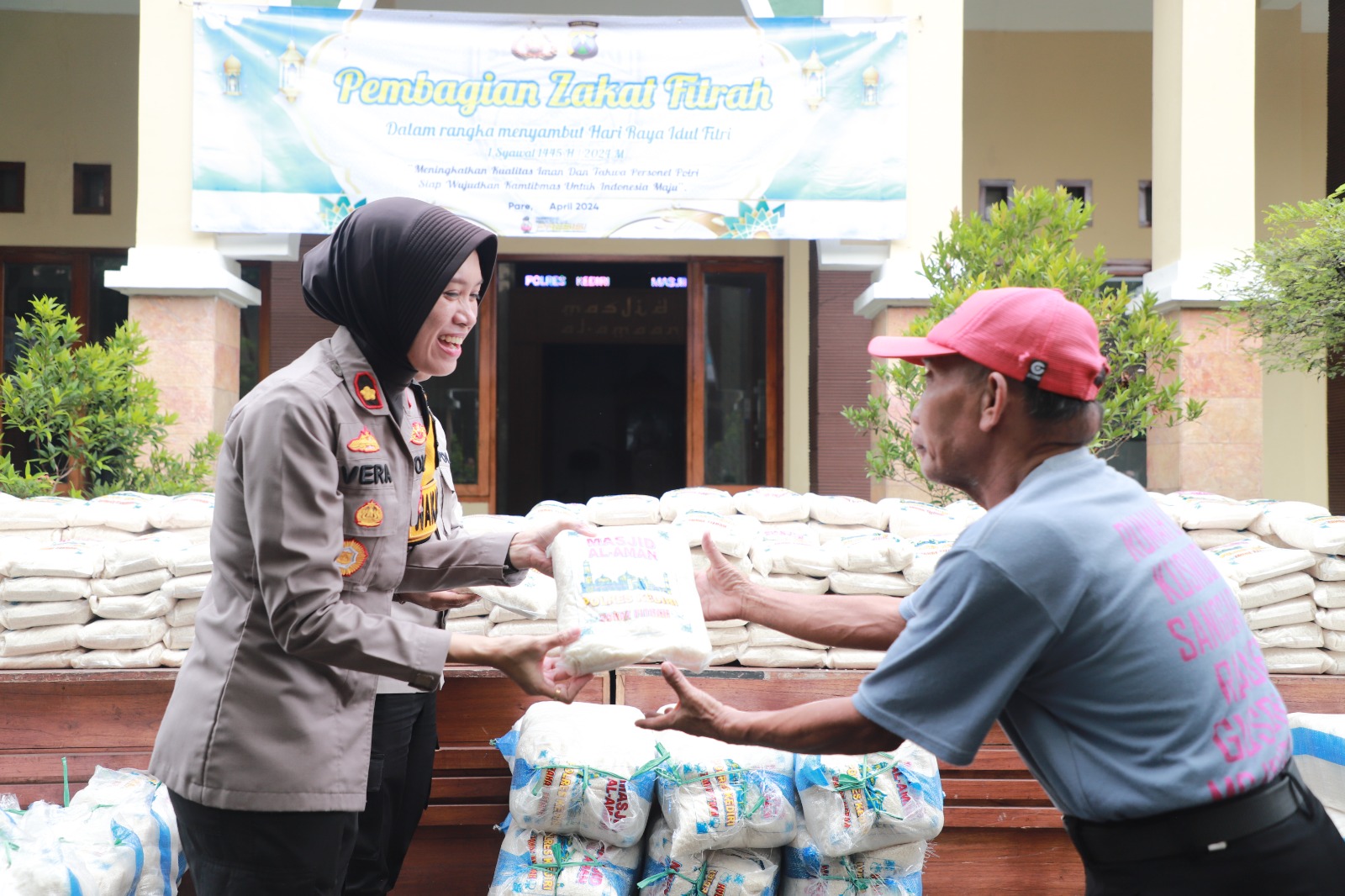 Kapolres Kediri AKBP Bimo Ariyanto bersama Waka Polres Kediri Kompol Verawaty Thaib beserta jajaran turut serta membagikan zakat fitrah berupa beras pada warga yang membutuhkan.
