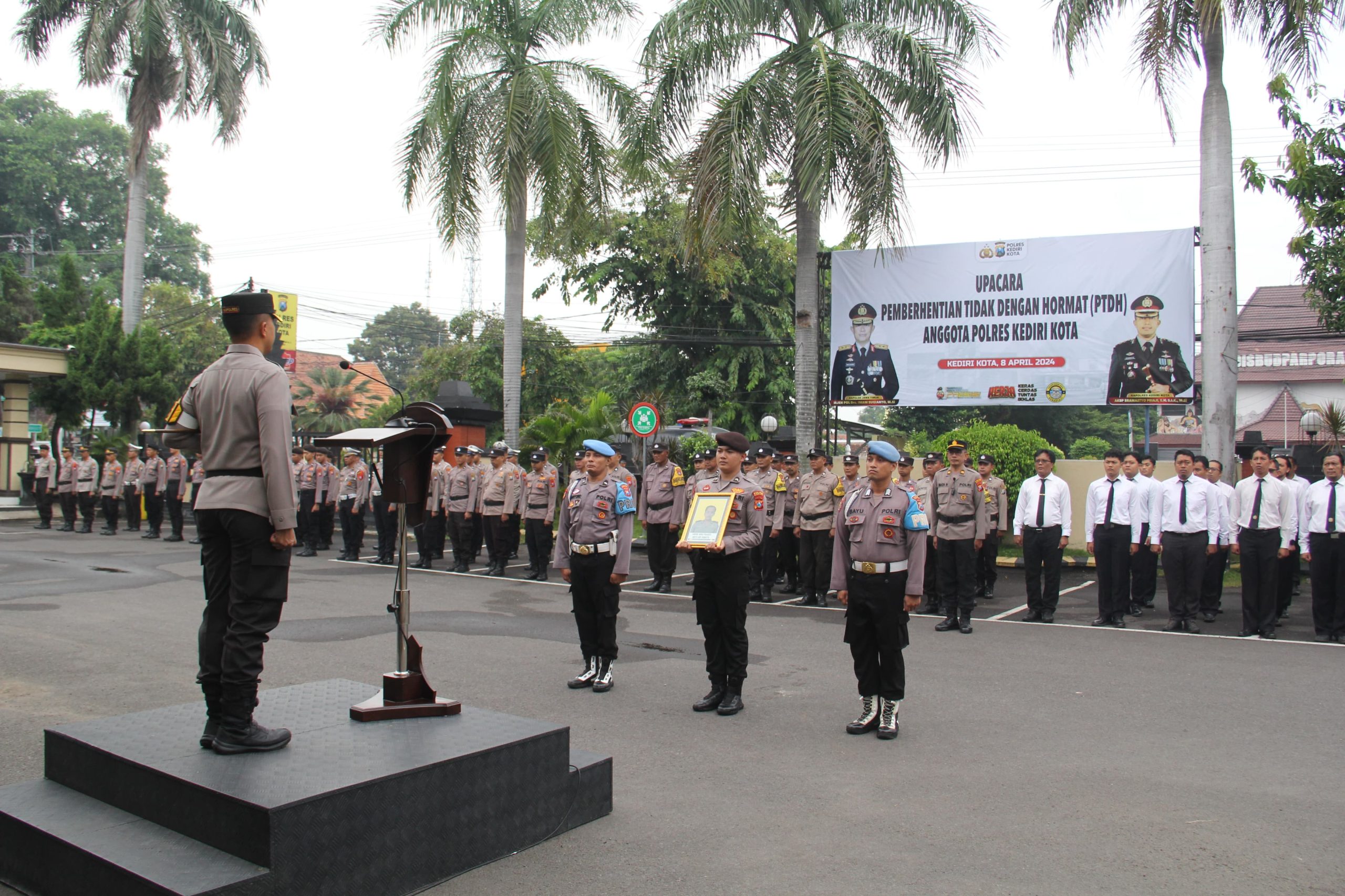 Upacara PTDH dipimpin langsung Kapolres Kediri Kota AKBP Bramastyo Priaji, dihadiri Wakapolres Kompol Dodik Tri Hendro Siswoyo, Pejabat Utama, Kapolsek Jajaran dan anggota Polres serta ASN, Senin (8/4/24)