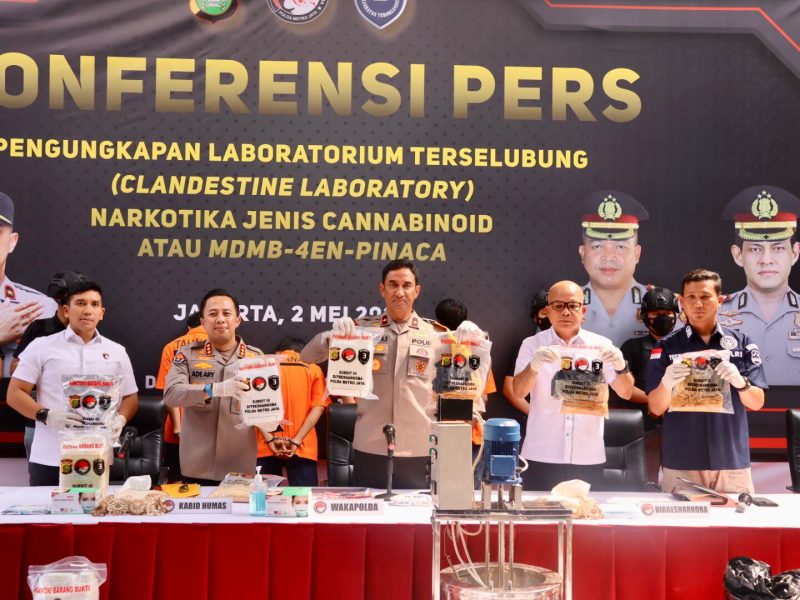 Jakarta – Direktorat Reserse Narkoba Polda Metro Jaya mengungkap laboratorium terselubung atau clandestine laboratory narkotika jenis cannabinoid/MDMB-4en-Pinaca atau ganja sintetis di Cluster Mountain View, Jalan Gunung Pangrango Nomor 185, Sentul, Babakan Madang, Kabupaten Bogor. Dari pengungkapan ini, Polisi menangkap lima orang tersangka. Kamis (2/5/2024).