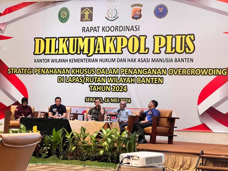 Cilegon, INFO_PAS – Dalam upaya mengatasi masalah overcrowding yang terjadi di Lapas/Rutan wilayah Banten, Kantor Wilayah Kementerian Hukum dan Hak Asasi Manusia (Kemenkumham) Banten menggelar rapat koordinasi DILKUMJAKPOL PLUS tahun 2024. Rapat yang digelar pada hari ini di kantor wilayah tersebut membahas strategi penahanan khusus untuk mengatasi masalah tersebut. Kamis (16/05) pagi.