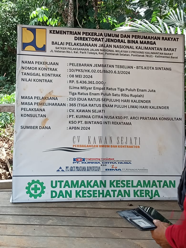 PurnamaNews.com – Sintang, Kalbar. Permasalahan akses transportasi ratusan warga Sintang di Kecamatan Sei Tebelian, Kabupaten Sintang, Provinsi Kalimantan Barat menjadi sorotan, setelah banyak dikeluhkan warga masyarakat lantaran di beberapa titik pekerjaan proyek pelebaran unit jembatan TEBELIAN – BTS. KOTA SINTANG dengan Nomor Kontrak (10/PKS/HK.02.01/Bb20.63/2024), nilai kontrak kerja sebesar Rp.5.436.361.000,-. Dan masa pemeliharaan 365 hari kalender, terhitung sejak tanggal 08 Mei 2024, bersumber dari dana APBN 2024, mengalami kendala dikarenakan mandek selama kurang lebih 2 pekan hingga berita ini di terbitkan.