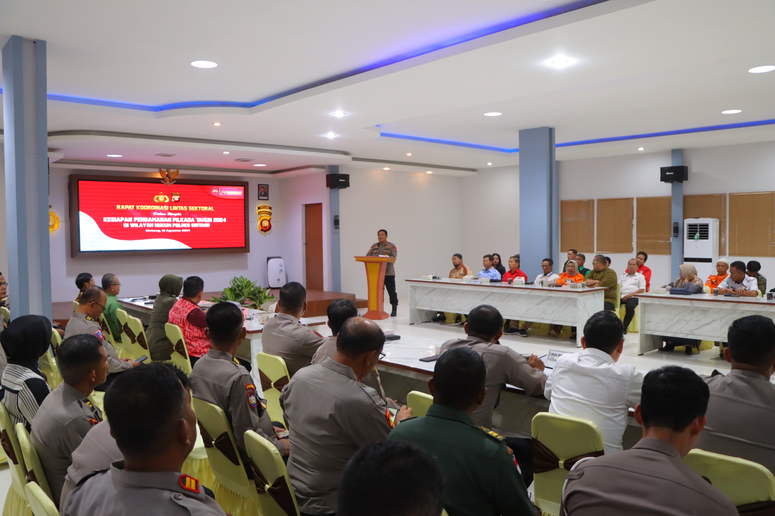Purnamanews.com – Sintang,Polda Kalbar. Polres Sintang menggelar Rapat Koordinasi Lintas Sektoral (Rakor Linsek) yang dilaksanakan di Aula Polres Sintang, hari ini menandai komitmen kuat berbagai elemen di Kabupaten Sintang dalam mempersiapkan pengamanan Pilkada Serentak 2024. Acara ini dihadiri oleh sejumlah instansi terkait, termasuk Dandim 1205/Stg, Letkol Inf Rangga Bayu Widiartha, Bupati Sintang di wakili oleh Herkulanus Roni Kadis PMPD Sintang ,KPU Sintang, Bawaslu Sintang, jajaran TNI Polri dan Pemda serta para tokoh masyarakat dan perwakilan dari berbagai partai politik. Kamis (15/08/2024) siang.