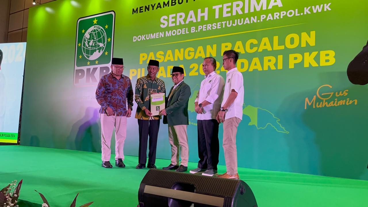 PURNAMANEWS.COM, OKI – Ketua Umum Partai Kebangkitan Bangsa (PKB) Muhaimin Iskandar alias Cak Imin menyerahkan dokumen model B Persetujuan Parpol KWK (B1KWK) untuk pasangan H.M. Dja’far Shodiq dan Abdiyanto SH MH di Pemilihan Bupati dan Wakil Bupati (Pilbup) Ogan Komering Ilir (OKI) 2024.