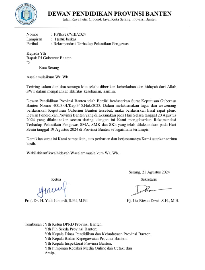 Berdasarkan hasil rapat pleno Dewan Pendidikan Provinsi Banten yang dilaksanakan pada Hari Selasa tanggal 20 Agustus 2024 yang dilaksanakan secara daring, dengan ini Dewan Pendidikan Provinsi Banten mengeluarkan Rekomendasi Terhadap Pelantikan Pengawas SMA, SMK dan SKh yang telah dilaksanakan pada Hari Senin tanggal 19 Agustus 2024 di Provinsi Banten dan dihadiri oleh 8 dari 9 anggota dan pengurus Dewan Pendidikan Provinsi Banten, maka dengan ini Kami sepakat mengeluarkan rekomendasi dengan dasar hukum sebagai berikut :