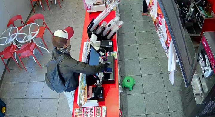 Seorang pria mengenakan jaket dan topi datang mengendarai sepeda motor, masuk ke dalam toko dan melihat-lihat sekitar toko. Merasa aman lalu pelaku mencuri telepon seluler dari meja kasir, pelaku keluar langsung pergi mengendarai sepeda motor.
