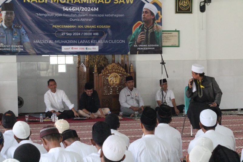 CILEGON, INFO_PASS – Lembaga Pemasyarakatan (Lapas) Kelas IIA Cilegon menyelenggarakan peringatan Maulid Nabi Muhammad SAW 1446 H dengan khidmat. Acara ini dihadiri oleh seluruh warga binaan, petugas Lapas, serta sejumlah tokoh masyarakat. Peringatan yang dilaksanakan di masjid al-muhajirin Lapas Cilegon ini diisi dengan ceramah keagamaan oleh KH. Unang Kosasih, pimpinan Pondok Pesantren Al Karomah Kecamatan Merak. Jumat (27/09).