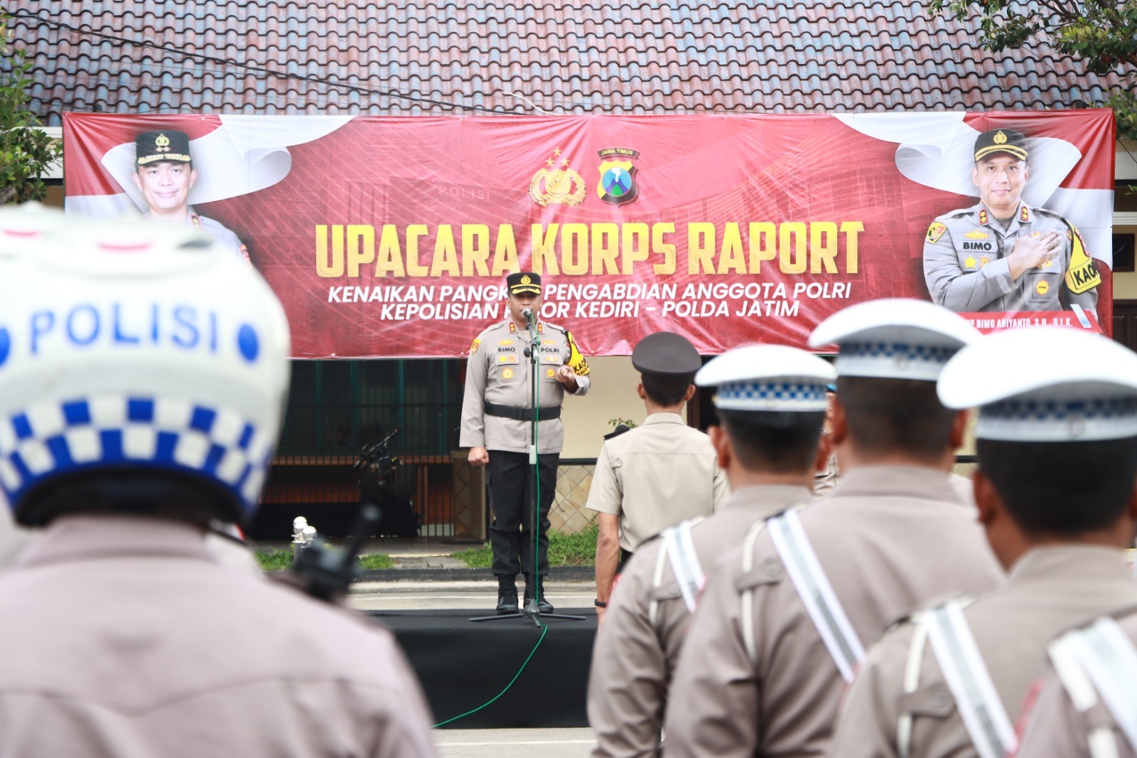 Purnamanews.com | Kediri– Polres Kediri Polda Jatim kembali menggelar upacara korps raport kenaikan pangkat pengabdian anggota Polri.