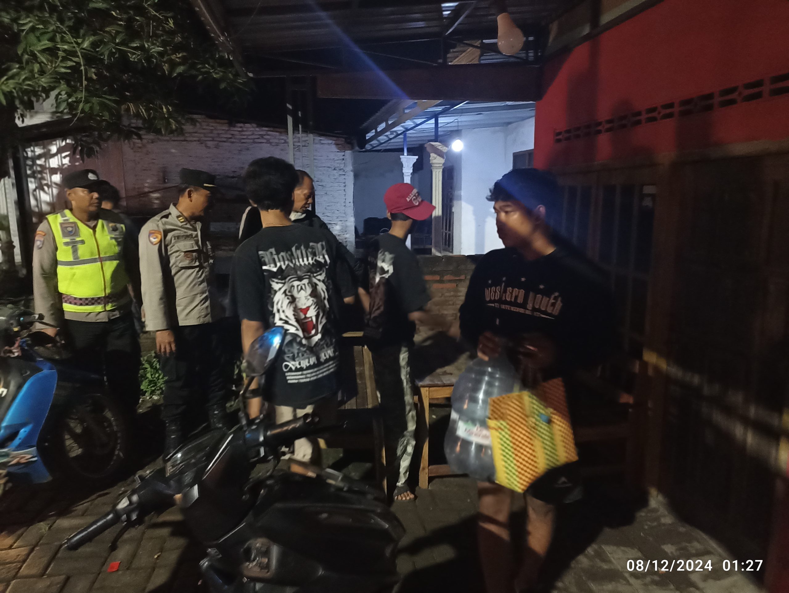 Tampak Kabag Ops Polres Kediri Kota Kompol Mukhlason, Kanit Gakkum Satlantas Polres Kediri Kota Ipda Andi Anang Dwi Fauzi Sulaiman, dan para personel jajaran Polres Kediri Kota sedang mendatangi serta melakukan pemeriksaan terhadap puluhan pesilat yang kedapatan sedang berkerumun di wilayah Banyakan, Kabupaten Kediri.