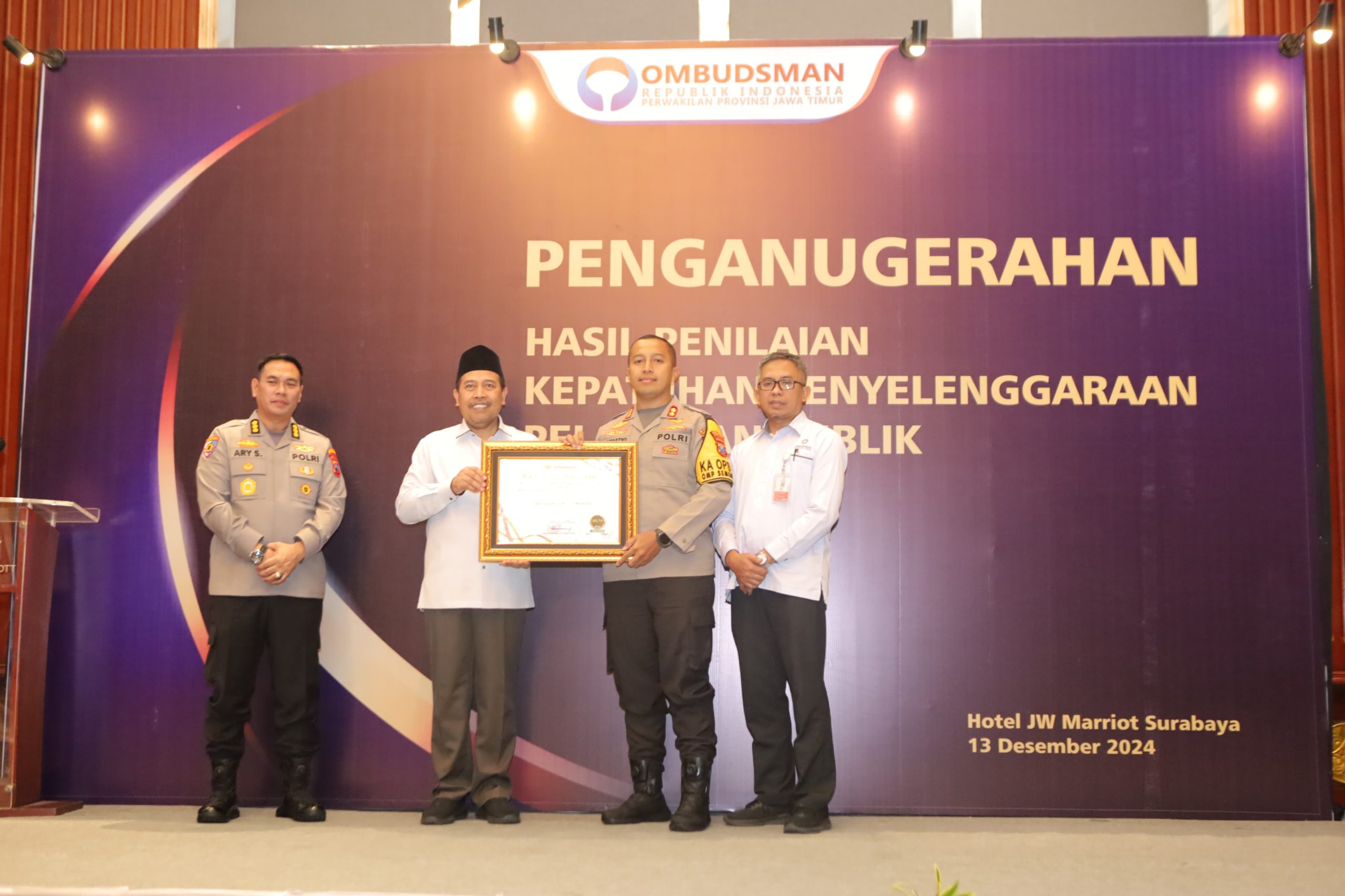 Apresiasi tersebut diberikan pada saat Penganugerahan Hasil Penilaian Kepatuhan Penyelenggaraan Pelayanan Publik oleh Ombudsman RI di Hotel JW Marriot Surabaya, Jumat 13 Desember 2024.Penghargaan dari Ombudsman RI itu diterima langsung oleh Kapolres Kediri Kota AKBP Bramastyo Priaji.