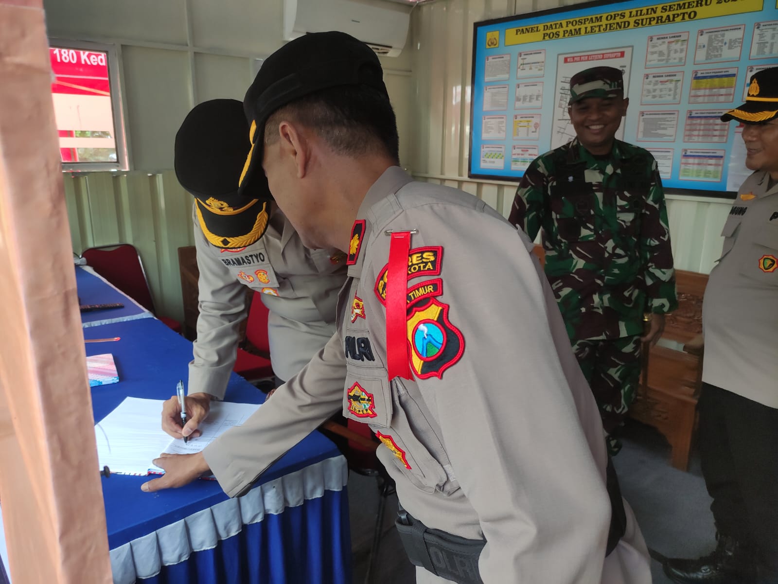 Purnamanews.com | Kediri Kota – Kapolres Kediri Kota AKBP Bramastyo Priaji kunjungi Pospam I Ops Lilin Semeru 2024 di Jalan Letjen Suprapto Kelurahan Burengan Kecamatan Pesantren Kota Kediri Jawa Timur, Jumat ( 27/12/2024 ). Ikut hadir bersama rombongan dalam kunjungan ini, yakni Dandim dan Karumkit Bhayangkara Kediri.