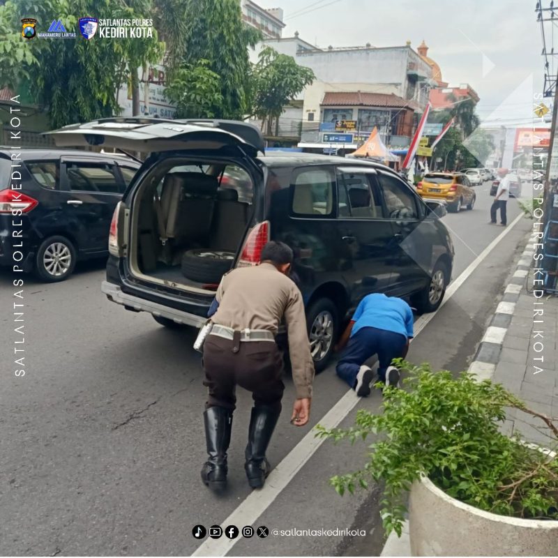 Purnamanews.com | Kediri Kota –  Petugas Pos Pelayanan Alun-Alun Kota Kediri menunjukkan respons cepat dalam membantu pengendara mobil yang mengalami insiden ban belakang terlepas di tengah jalan, Minggu (30/12).