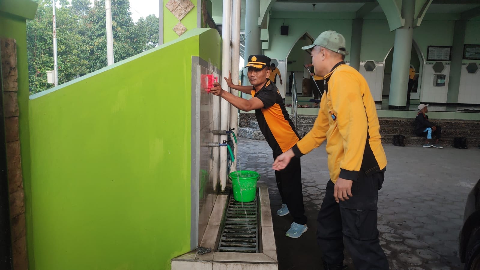 Bersama personel, Kapolsek Pesantren membersihkan berbagai area di Lingkungan masjid Ar Rohmat, termasuk tempat wudhu, kamar mandi, saluran air, karpet, kaca, lantai, jendela, dan halaman masjid Ar Rahmat.