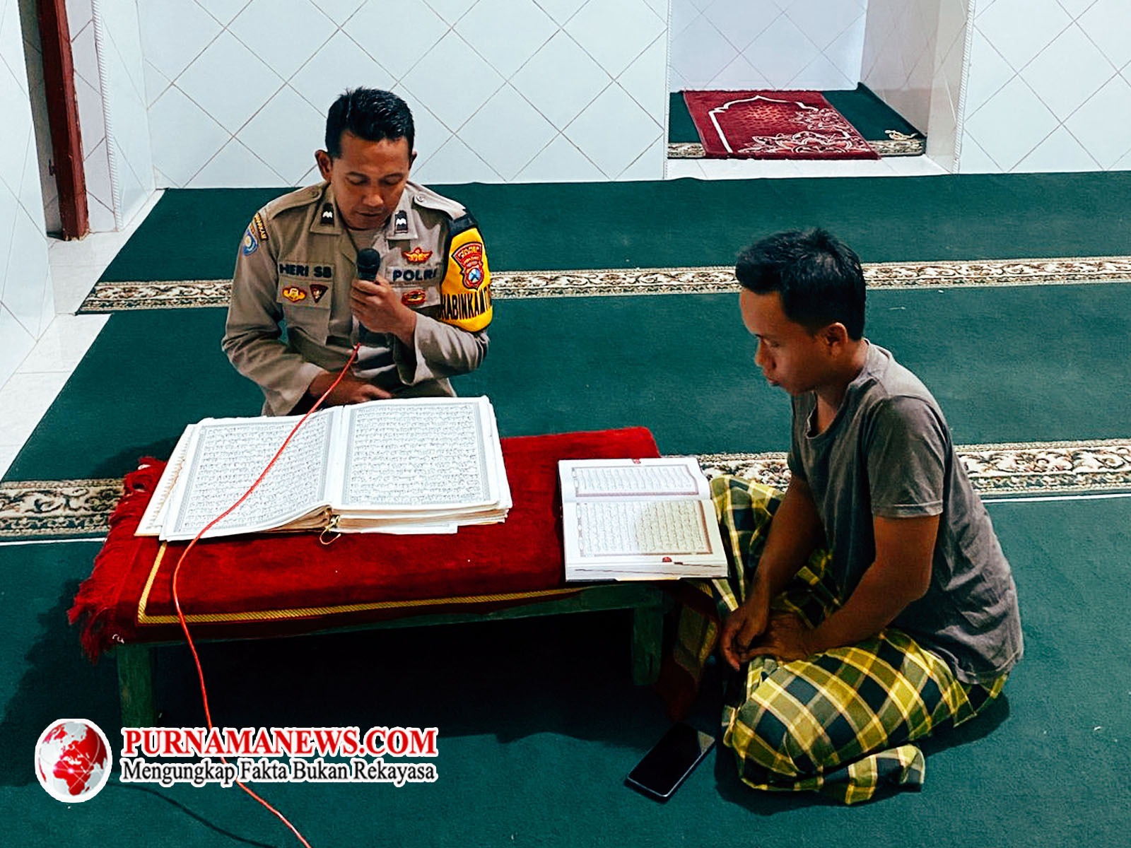 Sang Bhabinkamtibmas, yang biasanya berdiri tegap di tengah tugasnya menjaga ketertiban, kini duduk bersimpuh, jemarinya menyentuh lembaran mushaf, mengikuti bacaan dengan penuh khidmat..