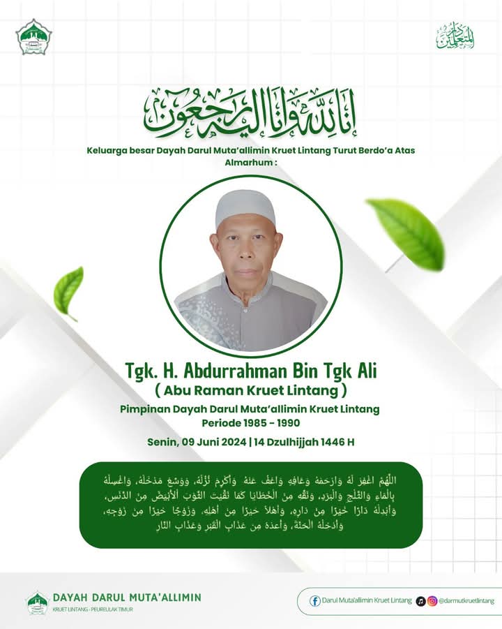 Innalillahi wa Inna ilaihi Raji’un, Telah meninggal dunia Tgk. H. Abdurrahman Bin Tgk Ali, tokoh agama sekaligus tokoh masyarakat Gampong Kruet Lintang. Beliau dikenal luas sebagai pemimpin Pesantren/Dayah Darul Muta’allimin di Gampong Kruet Lintang pada tahun 1985 hingga 1990.