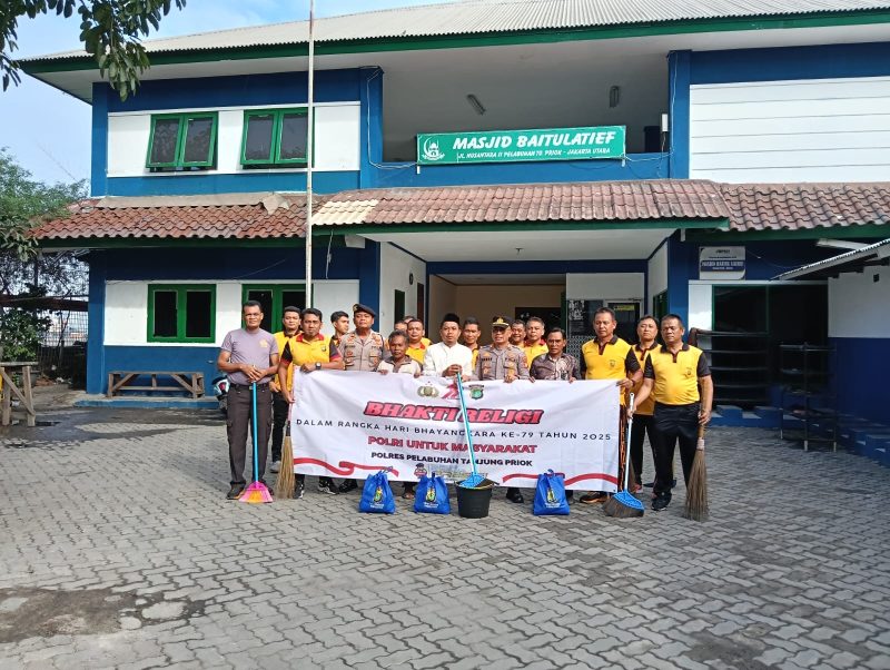 Jakarta – Dalam rangka menyambut Hari Ulang Tahun Bhayangkara ke-79 Tahun 2025, Polres Pelabuhan Tanjung Priok Polda Metro Jaya menggelar kegiatan Bakti Religi dengan melakukan aksi bersih-bersih tempat ibadah serta pemberian alat kebersihan dan paket sembako.