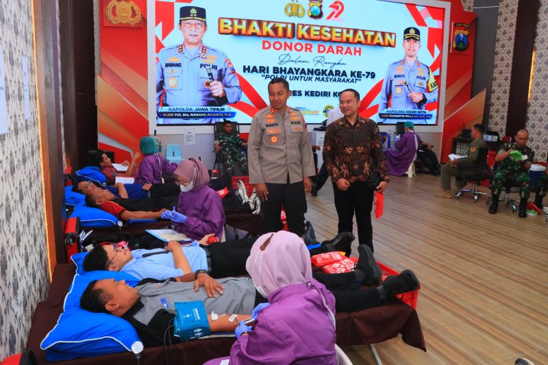 Kapolres Kediri Kota, AKBP Bramastyo Priaji, S.H., S.I.K., M.Si. menyampaikan, kegiatan donor darah menjadi bagian dari rangkaian kegiatan peringatan Hari Bhayangkara ke-79 di sela-sela kegiatan.