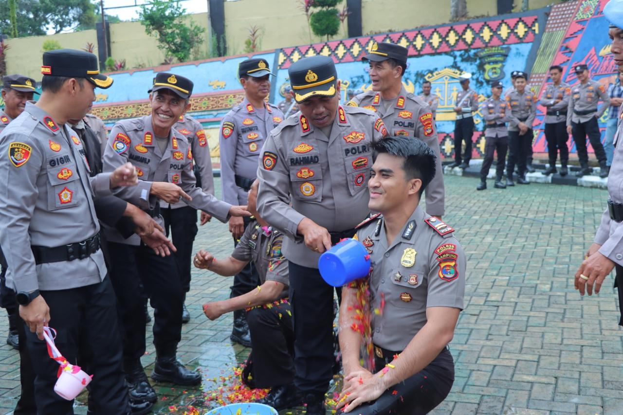 Rangkaian itu, Kapolres bersama para pejabat utama, Kapolsek jajaran dan personil lainya memberikan ucapan selamat serta penyiraman air tanda kebahagiaan bersama-sama.