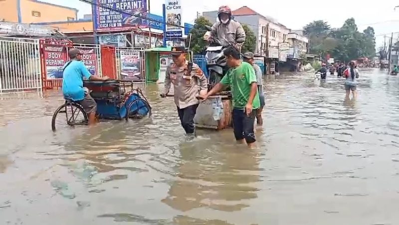 Tak hanya memantau, AKP Edi Suryadi bahkan terjun langsung membantu proses evakuasi warga yang rumahnya terendam banjir. Menggunakan gerobak sederhana, beliau membantu menyeberangkan warga dan pengendara sepeda motor yang kesulitan melintasi genangan air.