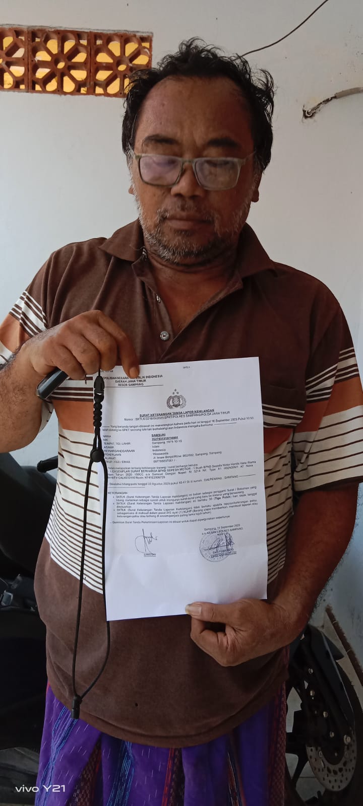 PURNAMA NEWS.COM |SAMPANG — Hidup Samsuri, warga Jalan Imam Bonjol, Kelurahan Dalpenang, Kecamatan Sampang, mendadak diliputi duka. Sebuah dokumen penting yang selama ini ia jaga, BPKB motor Vario hitam tahun 2020, hilang secara misterius di rumahnya sendiri.