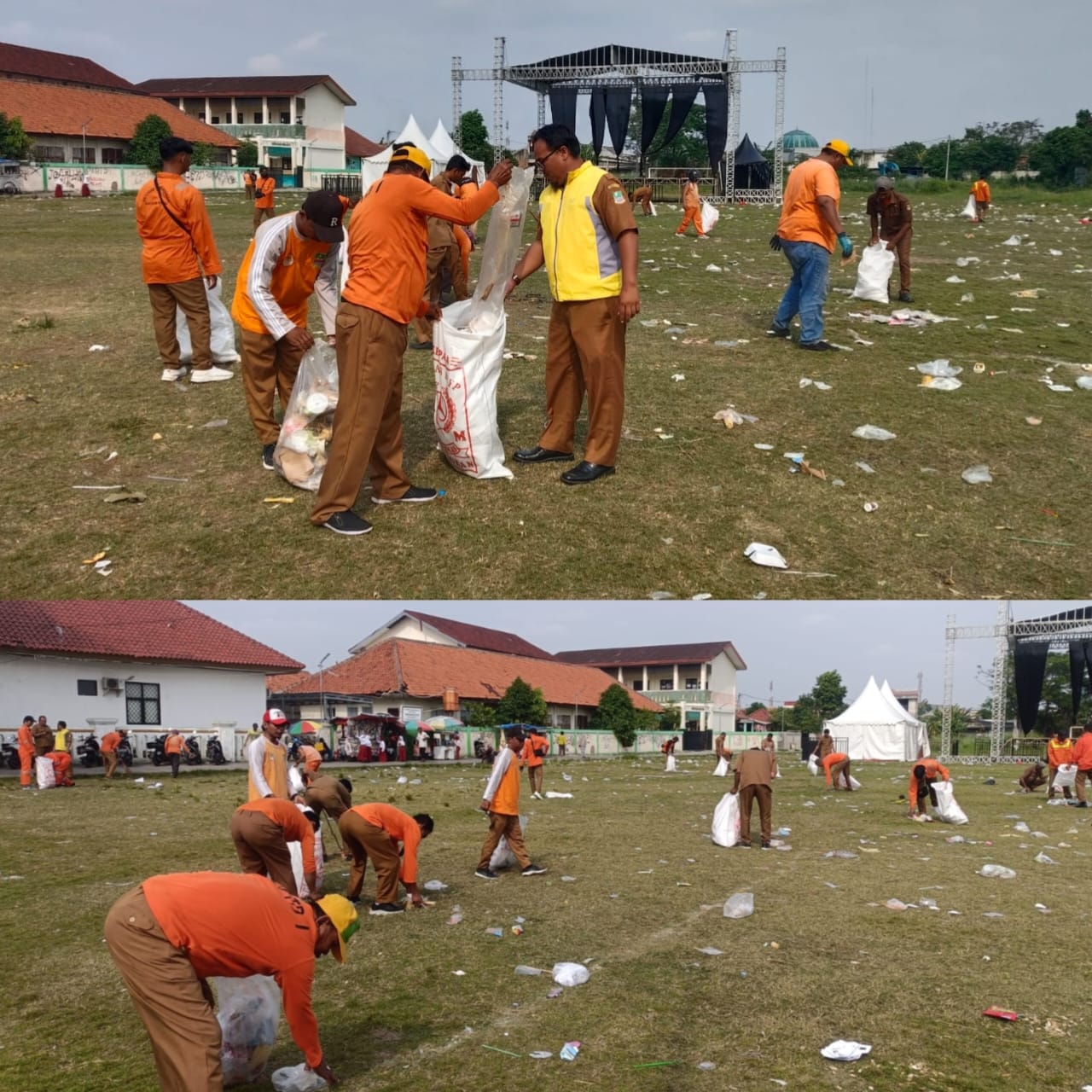 “Sampah yang berserakan baik dilapangan maupun tempat parkir dan lainnya, dengan sekejap, diarea Lapangan Kelurahan Bahagia, sudah bersih kembali tanpa ada sampah yang tersisa semuanya dibersihkan dan diangkut menggunakan mobil baktor kendaraan sampah yang akan diangkut menuju Tempat Pembuangan Akhir (TPA)  sampah Burangkeng, Senin (29/9/2025).