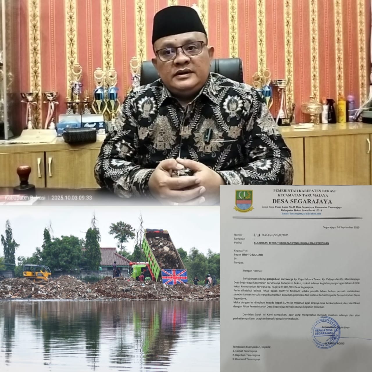 Sehubungan dengan kegiatan pengurukan kami atas nama pemerintah desa segara jaya, melayangkan surat yang pertama, yaitu Klarifikasi terkait kegiatan pengurugan dan perizinan, sehubungan adanya pengaduan dari warga Kampung Ceger Muara Tawar, Kampung Paljaya dan kampung mandalajaya desa segara jaya kecamatan tarumajaya kabupaten bekasi.