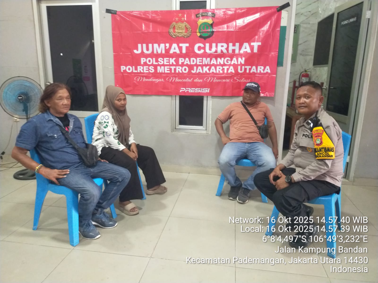 Jakarta Utara — Dalam upaya mempererat hubungan antara kepolisian dan masyarakat, Polsek Pademangan melaksanakan kegiatan Jumat Curhat di Sekretariat RW 04 Kelurahan Ancol, Kecamatan Pademangan, Jakarta Utara, Kamis (16/10/2025) sore.