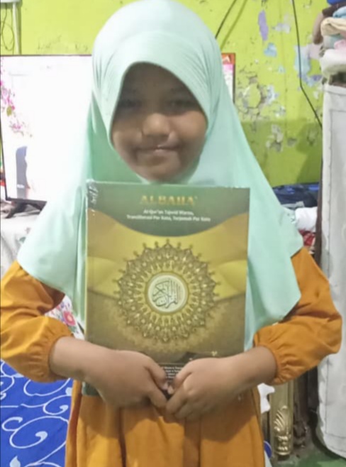 Al-Qur’an yang diterimanya merupakan edisi Al-Bahja’, terjemahan dan tafsir tematik yang dikenal memudahkan pemahaman bagi anak-anak dan remaja. Di balik senyum polosnya, tersimpan harapan besar untuk bisa membaca dan memahami ayat-ayat Allah dengan lebih baik.