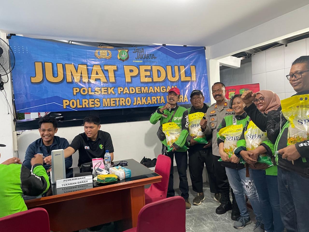Jakarta Utara – Polsek Pademangan melaksanakan kegiatan sosial bertajuk “Jumat Peduli” dengan membagikan 100 paket sembako dan layanan pemeriksaan kesehatan kepada Komunitas Ojek Online se-Kecamatan Pademangan, Jumat (24/10/2025).