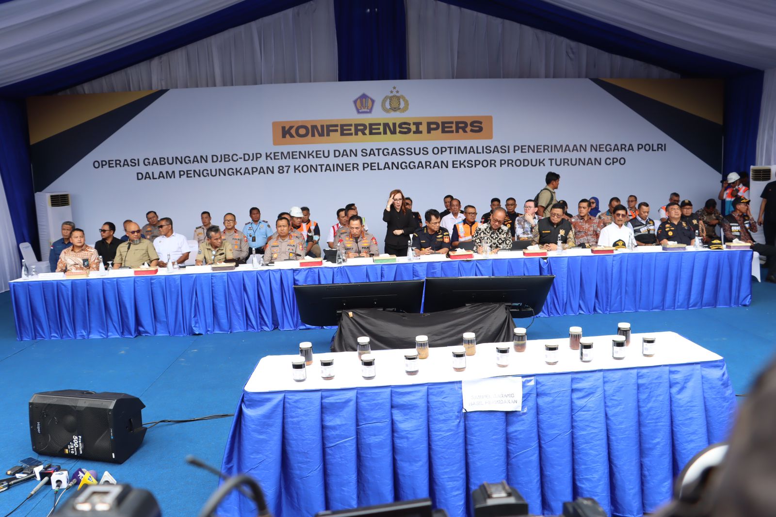 Jakarta – Kapolres Pelabuhan Tanjung Priok AKBP Dr. Martuasah H. Tobing, S.I.K., M.H., memimpin Pengamanan Konferensi Pers, Kepolisian Negara Republik Indonesia bersama Kementerian Keuangan terkait pengungkapan kasus ekspor ilegal produk turunan Crude Palm Oil (CPO) di Buffer Area NPCT 1, Kalibaru, Jakarta Utara. Sebanyak 87 kontainer berisi produk turunan sawit dengan nilai kerugian negara mencapai Rp2,8 triliun berhasil diamankan dalam operasi bersama ini.