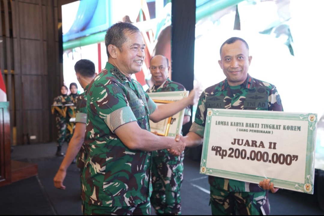 Banyumas – Korem 052/Wijayakrama Kodam Jaya, berhasil menorehkan prestasi membanggakan dengan meraih Juara Kedua pada Lomba Karya Bakti tingkat Korem jajaran TNI Angkatan Darat. Penghargaan tersebut diserahkan langsung oleh Kepala Staf Angkatan Darat (Kasad) Jenderal TNI Maruli Simanjuntak, M.Sc., kepada Danrem 052/Wkr Brigjen TNI Faizal Rizal, S.I.P., pada penutupan Apel Dansatkowil TNI AD yang berlangsung di Ballroom Hotel Java Heritage, Banyumas, Jumat (14/11/2025).