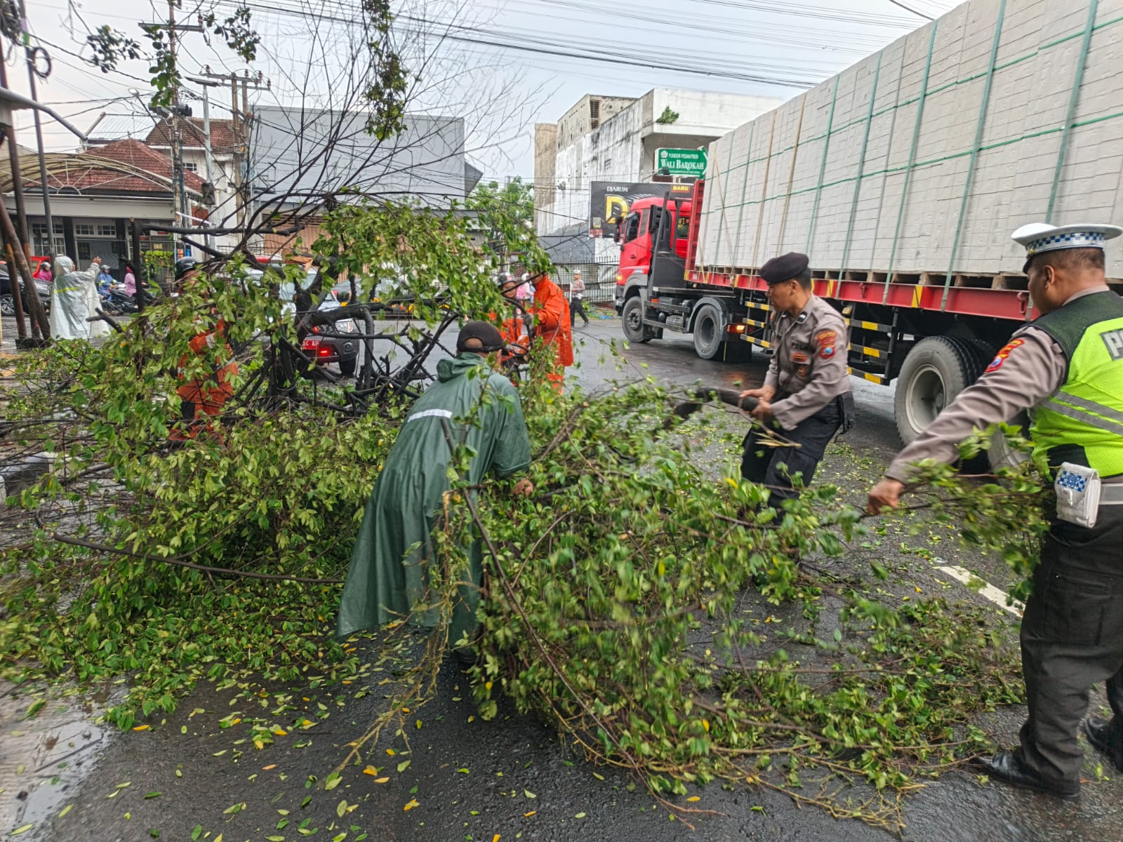 PURNAMA NEWS.COM | KEDIRI KOTA – Hujan yang mengguyur wilayah Kota Kediri, Jawa Timur, pada Kamis sore, 20 November 2025, menyisakan cerita tentang kesiapsiagaan aparat kepolisian di tengah kondisi cuaca yang tak menentu. Sebuah pohon tua jenis kersen atau seri/ceri (Muntingia calabura) tiba-tiba roboh di ruas Jalan Letjen Suprapto–Letjen Sutoyo, Kecamatan Pesantren. Reruntuhan batang dan ranting pohon menutup sebagian badan jalan, menyebabkan arus lalu lintas tersendat.