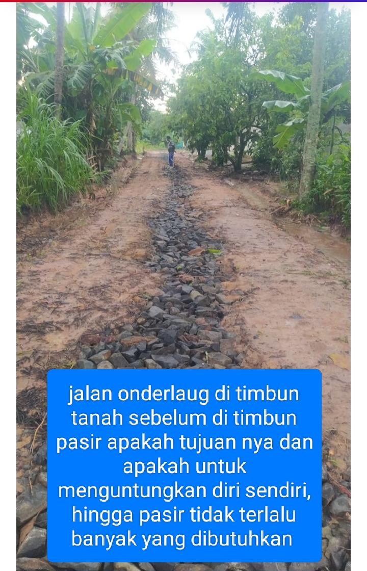 Sementara kepala desa karang Anom Diduga ingin menguntungkan diri sendiri pekerjaan onderlaug ditutup pakai tanah Hingga kebutuhan pasir tidak terlalu banyak dan saat dikonfirmasi kades karang Anom tidak menjawab konfirmasi awak media hingga berita terbit