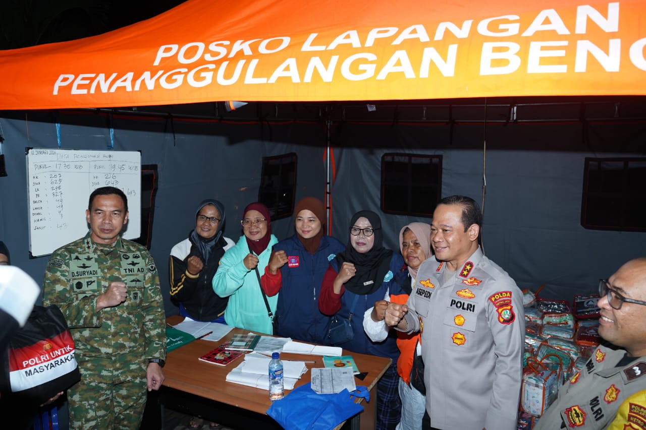 Jakarta Utara — Kapolda Metro Jaya Irjen Pol Asep Edi Suheri, S.I.K., M.Si bersama Pangdam Jaya Mayjen TNI Deddy Suryadi, S.I.P., M.Si mengunjungi para pengungsi korban banjir di Rusun Embrio, RW 04, Kelurahan Semper Barat, Kecamatan Cilincing, Jakarta Utara, Senin malam (12/1/2026).