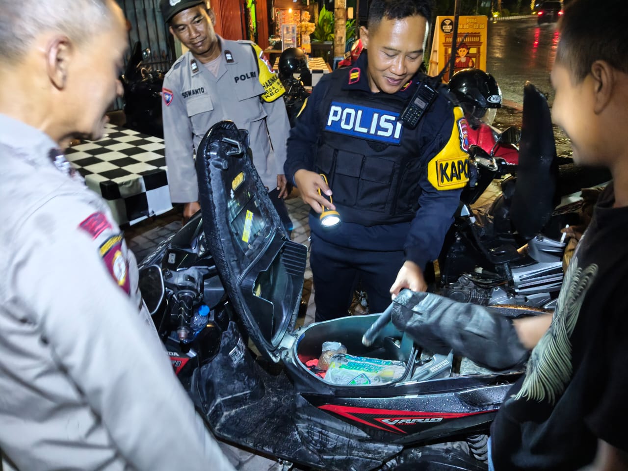 Selain itu, petugas juga melakukan pemeriksaan terhadap kendaraan bermotor yang tidak sesuai spesifikasi serta kendaraan yang terparkir mencurigakan di pinggir jalan. Imbauan kamtibmas diberikan secara humanis agar masyarakat tetap merasa aman dan nyaman.