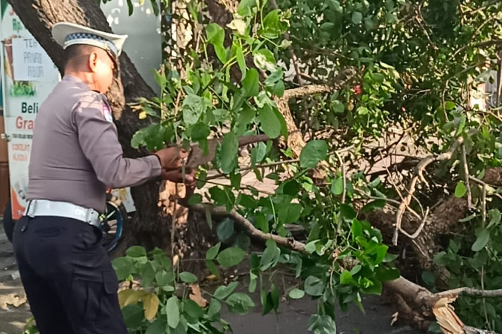 Satlantas Polres Kediri Kota Sigap Evakuasi Pohon Tumbang di Jalan Urip Sumoharjo