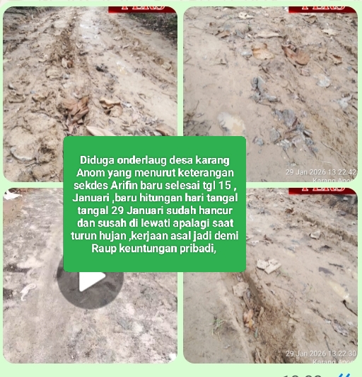 Sementara kepala desa karang Anom Diduga ingin menguntungkan diri sendiri pekerjaan onderlaug ditutup pakai tanah Hingga kebutuhan pasir tidak terlalu banyak dan saat dikonfirmasi kades karang Anom tidak menjawab konfirmasi awak media hingga berita terbit