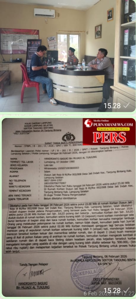 Purnamanews.com Lampung selatan- Tanjung Bintang dugaan terjadi perusakan atau pelemparan batu keatap rumah dan kaca steling pada hari Rabu 04 februari sekira jam 23:00 WIB korban bernama handrianto B ,serta teror petasan yang di ikat di pohon dan diarahkan ke rumah korban resmi di laporkan ke Polsek tanjung bintang