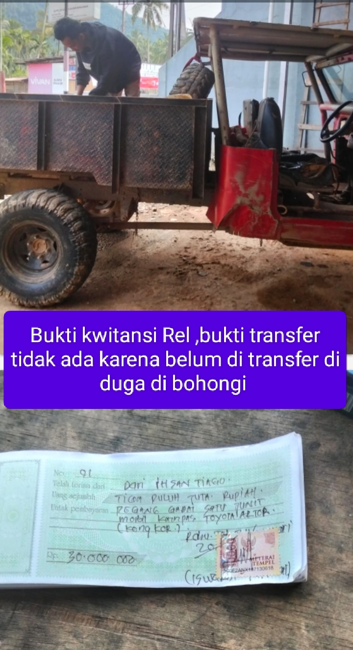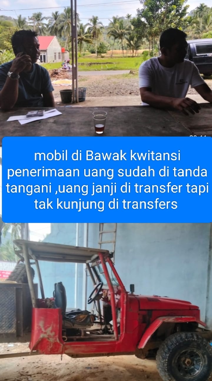 Sekilas kronologis yang berhasil di himpun awak media Masyarakat yang berinisial IS ,mintak jualin mobil hardtop modifikasi Rp 100 juta , sebelum laku ,di gade dulu sama oknum TNI Bernama Ihsan Tiago setelah di tanda tangani kwitansi penerimaan uang dari Ihsan T dan penerima warga inisial Is ,kemudian Ihsan bilang ntar di transfer uangnya ,tapi dari semenjak di tandatangani kwitansi hingga saat ini duit belum di transfer ,yang lebih membuat kecewa lagi ,oknum TNI tersebut bilang , hutang solar bos atau rekan kerjamu bayar sebesar 47 juta baru mobil bisa di ambil
