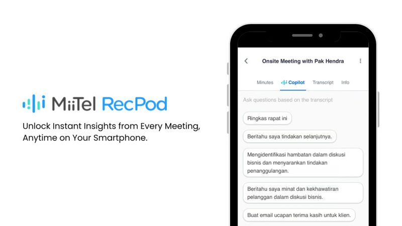 Penggunaan fitur Copilot sangat mudah: setelah meeting direkam pada aplikasi MiiTel RecPod di smartphone, pengguna dapat memilih pertanyaan dari opsi yang tersedia atau menuliskan pertanyaan secara bebas. Sistem kemudian akan memberikan jawaban instan berdasarkan transkripsi percakapan.