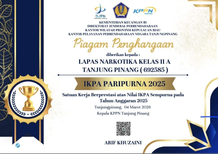Dengan diraihnya penghargaan IKPA Paripurna 2025 tersebut, Lapas Narkotika Kelas IIA Tanjungpinang diharapkan dapat terus mempertahankan kinerja terbaiknya serta menjadi contoh bagi satuan kerja lainnya dalam pengelolaan keuangan negara yang profesional dan berintegritas.