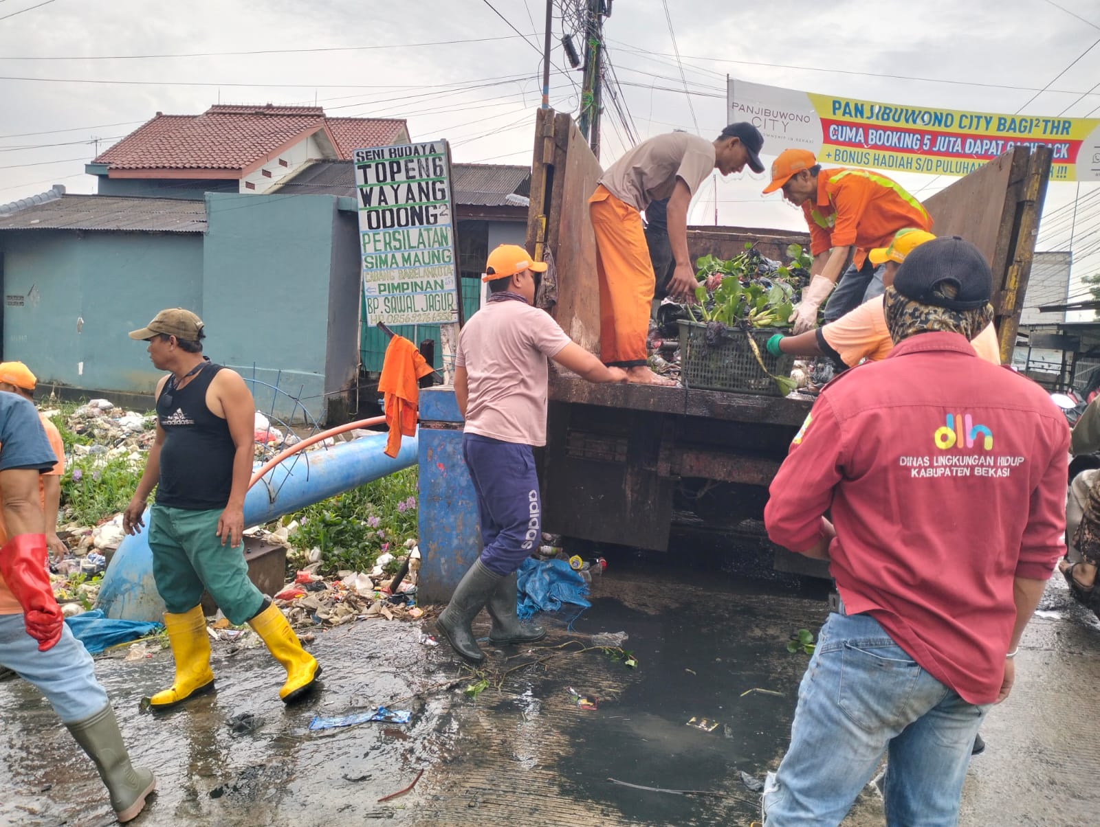 Bekasi – Hujan boleh turun, tapi semangat mereka tak ikut luruh, pasukan oranye UPTD Wilayah 1 Dinas Lingkungan Hidup Kabupaten Bekasi tetap semangat membersihkan dan mengangkut tumpukan sampah dan eceng gondok yang berada di Kali Kopeng, Desa Babelan Kota, Kecamatan Babelan.