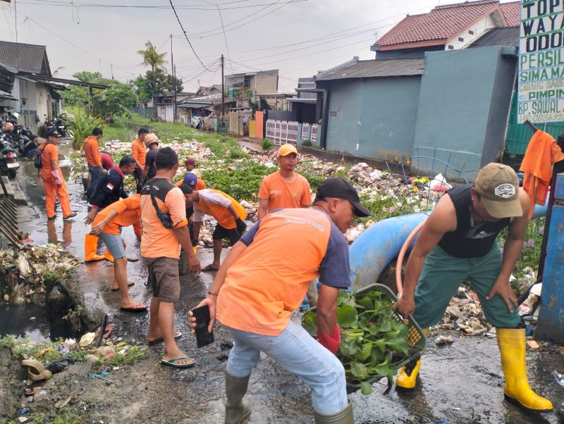 Bekasi – Hujan boleh turun, tapi semangat mereka tak ikut luruh, pasukan oranye UPTD Wilayah 1 Dinas Lingkungan Hidup Kabupaten Bekasi tetap semangat membersihkan dan mengangkut tumpukan sampah dan eceng gondok yang berada di Kali Kopeng, Desa Babelan Kota, Kecamatan Babelan.