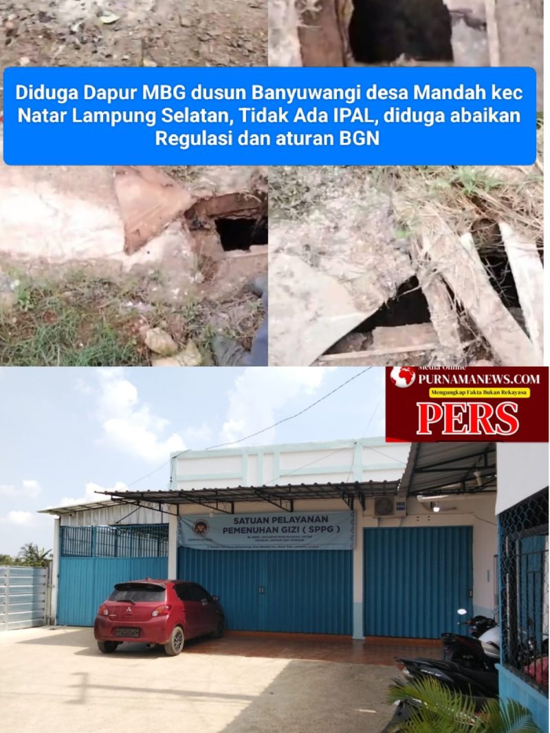 Sanitasi (SLHS). Tanpa sistem Pengolahan Limbah yang memadai, lain halnya yang terjadi di SPPG Dusun Banyuwangi Desa Manda Kecamatan Natar Kabupaten Lampung Selatan,diduga kuat akibat pengolahan limbah yang tidak memadai sehingga menimbul bau busuk yang sangat menyengat, Pada Senin 27 April 2026.