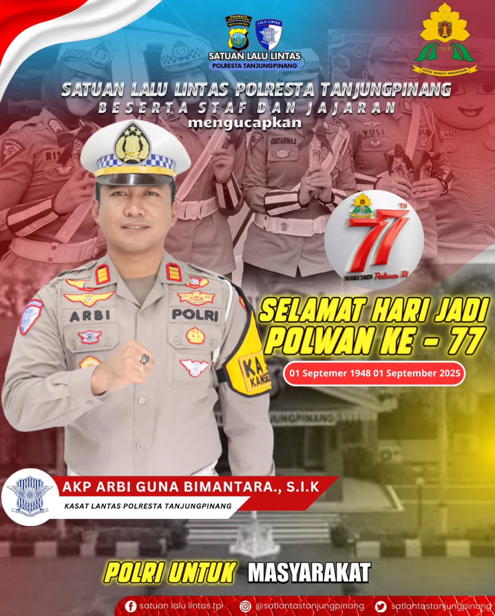Purnama News|Tanjungpinang Satuan Lalu Lintas (Satlantas) Polresta Tanjungpinang beserta staf dan jajaran menyampaikan ucapan selamat Hari Jadi Polisi Wanita (Polwan) Republik Indonesia ke-77 yang…